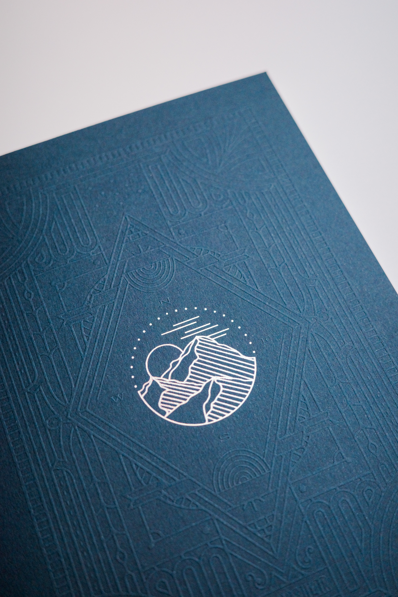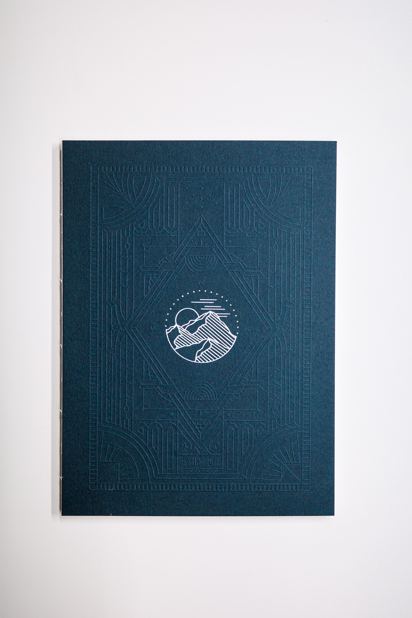 Caderno (165x230mm) de Lombada Exposta, com gravações em baixo Relevo, Termoestampagem Holográfica metálico e 46 folhas lisas
